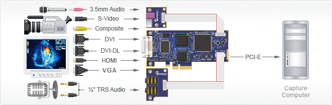 Pro有一個主雙鏈路DVI-I視頻捕捉輸入,一個SD視頻捕捉輸入,和平衡/非平衡音頻捕捉輸入。除了能夠捕獲從DVI,DVI-DL,VGA,BNC